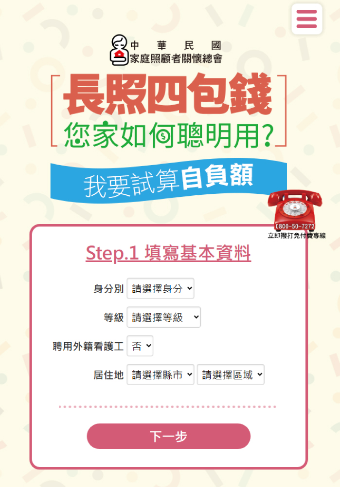如果您想了解長照服務的細項組合、補助金額與自負額,歡迎使用「家庭照顧者關懷總會」提供的線上試算工具,快速且方便地幫助您試算相關費用。